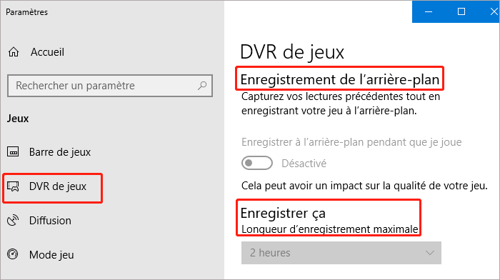 ② Avant l’enregistrement, vous pouvez personnaliser les paramètres d’enregistrement. Cliquez sur le bouton de « Paramètre » > « Configurez plus de préférences dans les Paramètres Windows » > « DVR de jeux » . Ici vous pouvez configurer « Longueur d’enregistrement » , « Vidéo enregistrée » et « Données audio enregistrées » . De plus, vous pouvez configurer l’enregistrement de l’arrière-plan.